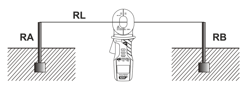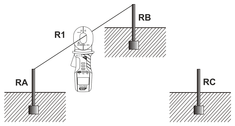 Jako pierwszy pomiar (patrz rysunek poniżej) połącz badany pręt RA z sondą RB i użyj przyrządu do pomiaru wartości rezystancji R1.