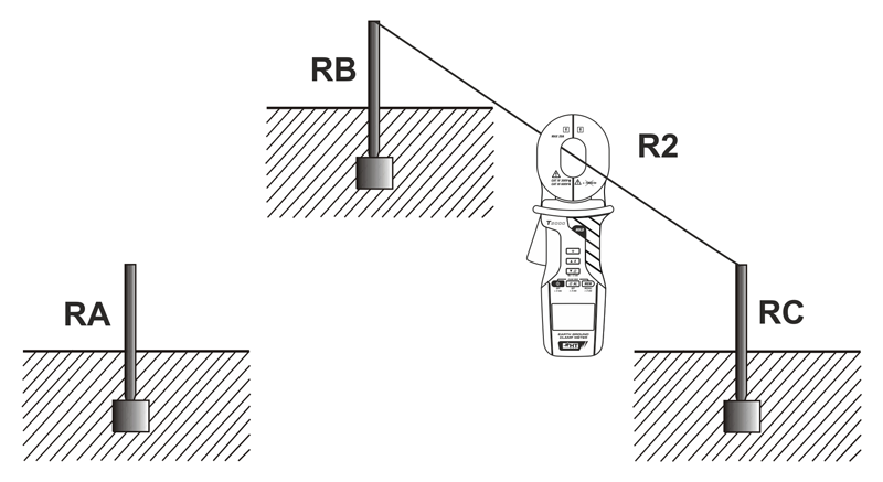 Jako trzeci pomiar (patrz rysunek poniżej) połącz sondę RC z badanym prętem RA i użyj przyrządu do pomiaru wartości rezystancji R3.