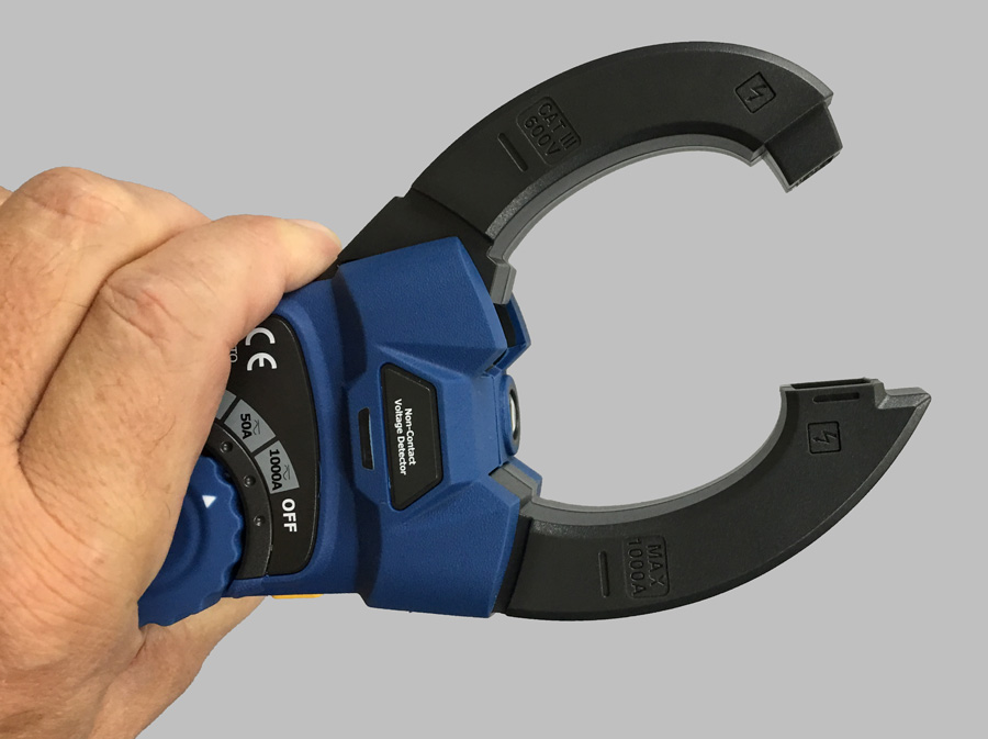 Pomiary AC True RMS oraz dwa zakresy pomiaru prądu poprzez cęgi 50A oraz 1000A.