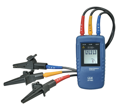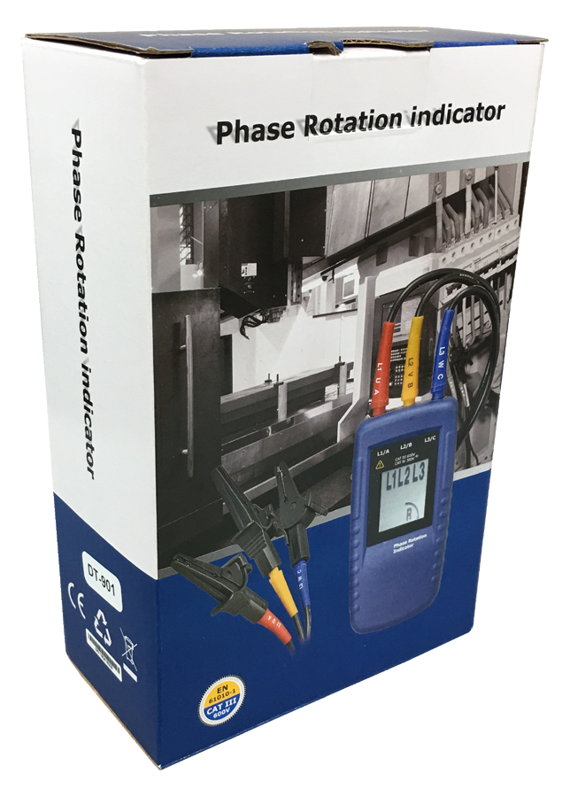 Wskaźnik kolejności faz DT-901 jest ręcznym przyrządem przeznaczonym do wykrywania kierunku wirowania faz w systemach trójfazowych.