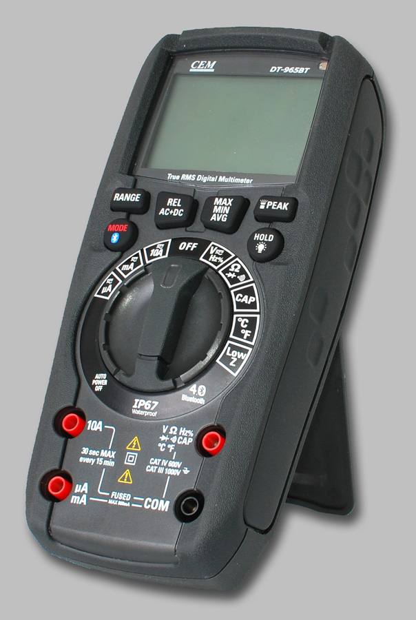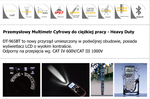 Miernik DT-965BT jest profesjonalnym, wodoszczelnym oraz odpornym na upadki multimetrem z licznikiem 6000. Spełnia wymagania CAT IV 600V co jest potwierdzeniem najwyższego poziomu wytrzymałości na przepięcia. Stanowi połączenie precyzji, łatwości użycia, bezpieczeństwa i niezawodności. DT-965BT to cyfrowy miernik przystosowany do użytkowania w ciężkich warunkach przemysłowych tzw. "Heavy Duty".