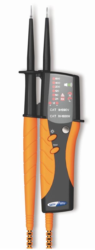 Cyfrowy multimetr palcowy HT6 zapewnia funkcje użyteczne w codziennym użytkowaniu. Oprócz pomiaru napięcia DC/AC i testu ciągłości HT6 oferuje funkcję sprawdzenia kolejności faz. W celu ułatwienia identyfikacji właściwego przewodu w tablicy rozdzielczej, w warunkach słabej widoczności, wbudowana biała latarka LED umożliwia pomiary nawet w całkowitej ciemności.