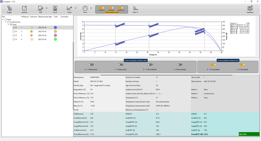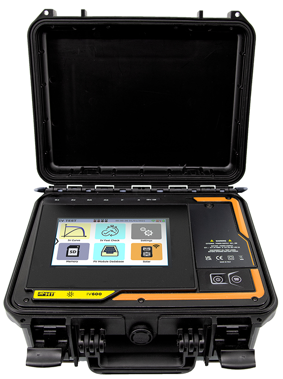 IV600 weryfikuje wydajność stringów fotowoltaicznych zgodnie z IEC/EN60891, wyznaczając charakterystykę I-V