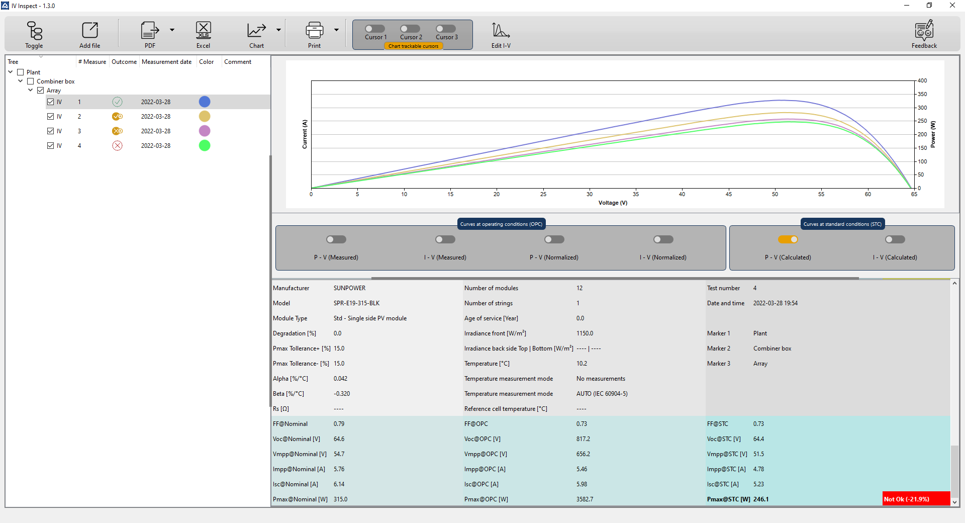 (standardowe warunki testowe: 1000 W/m2, 25°C, AM 1,5) i porównuje je z wartościami nominalnymi dostarczonymi