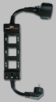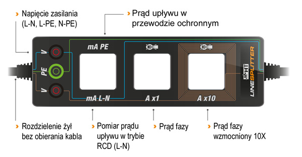 Dodatkowo Linesplitter jest wyposażony w gniazda ułatwiające pomiary napięć (L-N, L-PE, N-PE).