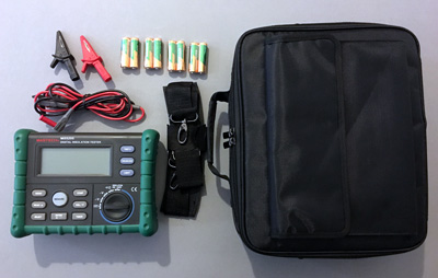 250V/500V/1000V/2,5kV do 100Gohm, do 3mA, auto PI/DAR, CAT IV 600V, pomiar napięcia AC/DC i test ciągłosci, pamięć, timer, MIN/MAX, REL, HOLD, podświetlenie, auto OFF, 0,95kg |
