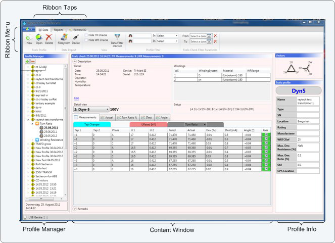 Tworzenie, import i eksport profili transformatorów oraz wyników pomiarów, jak również najprostsze ręczne pomiary wykonywane są za pomocą T-Base Pro. Rozbudowane funkcje wyszukiwania i nowoczesny graficzny interfejs użytkownika wspierają operatora w obsłudze profili transformatora oraz podczas pomiarów. Raporty z badań są dostępne w kilku formatach wyjściowych.