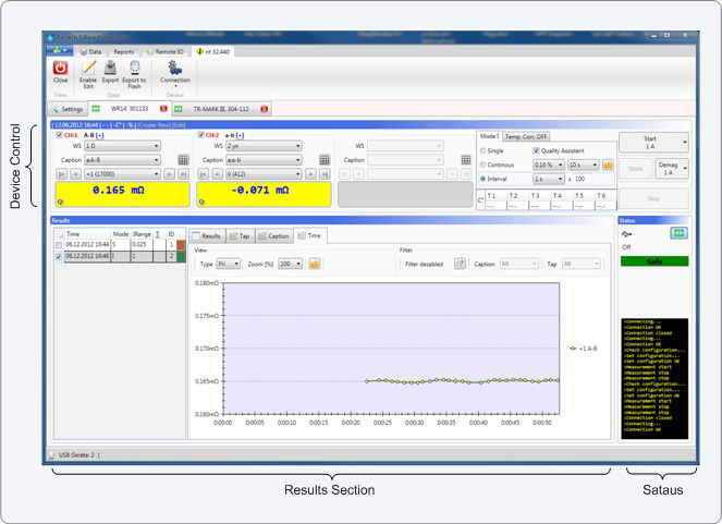 Szczegóły dotyczące statusu przyrządów i komunikacji są pokazane w sekcji statusu. Na przykładowym ekranie obok podłączony jest miernik rezystancji uzwojeń, jego stan jest bezpieczny i wymiana danych jest wylistowana na konsoli.