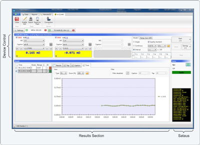 Sekcja sterowania przyrządu zawiera wszystkie opcje do ustawienia przyrządu oraz do wykonywania przez niego pomiarów. Pomiar jest rozpoczynany zaledwie po kilku kliknięciach i natychmiast są wyświetlane wyniki w sekcji wyników.
