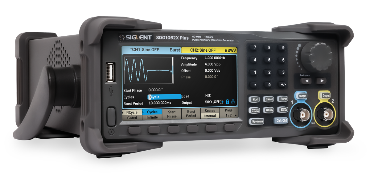 Seria SDG1000X Plus firmy SIGLENT to generatory dwukanałowe przebiegów funkcyjnych/arbitralnych o maksymalnej szerokości pasma 60 MHz, z częstotliwością próbkowania 1GSa/s i 16-bitową rozdzielczością pionową.