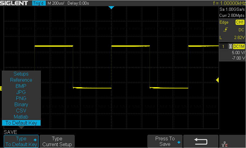 Bieżące parametry oscyloskopu mogą być zapisane pod domyślnym przyciskiem.