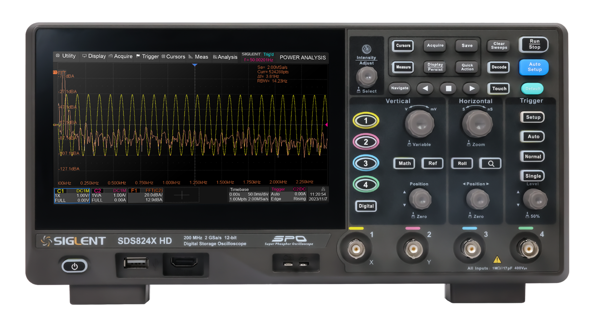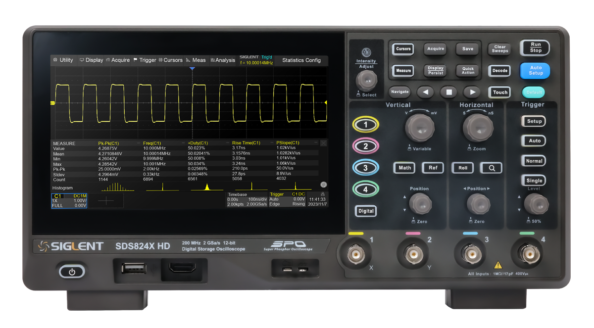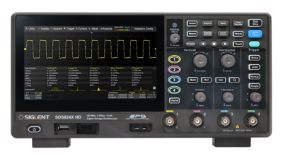 SIGLENT seria SDS800X HD to oscyloskopy cyfrowe o wysokiej rozdzielczości z pamięcią, próbkowaniem 2 GSa/s, wyposażone w 12-bitowe przetworniki analogowo-cyfrowe, zapewniające doskonałe parametry poziomu szumów. Są dostępne z szerokościami pasm 70MHz, 100MHz oraz 200 MHz, zapewniają maksymalną długość zapisu 100 Mpts mając 2 lub 4 kanały analogowe plus opcjonalnie 16 kanałów cyfrowych z możliwością analizy sygnału mieszanego.