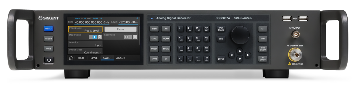 Generator sygnału mikrofalowego SSG6083A/SSG6085A/SSG6087A ma zakres częstotliwości wyjściowej od 100 kHz do 13,6/20/40 GHz,