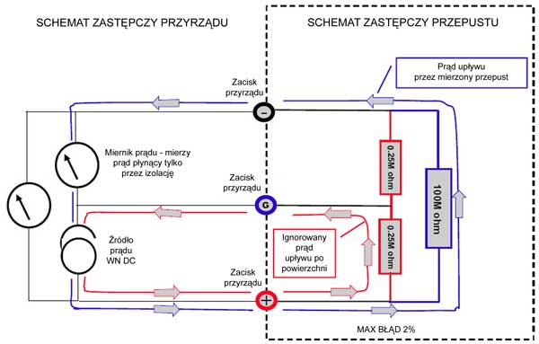 podłączony do zacisku GUARD, teraz upływność powierzchniowa płynie do zacisku