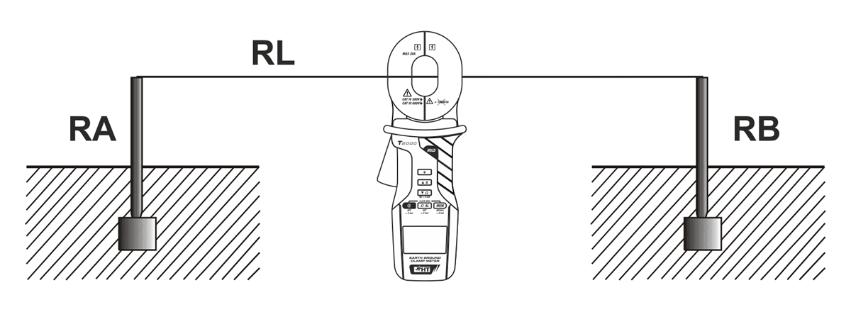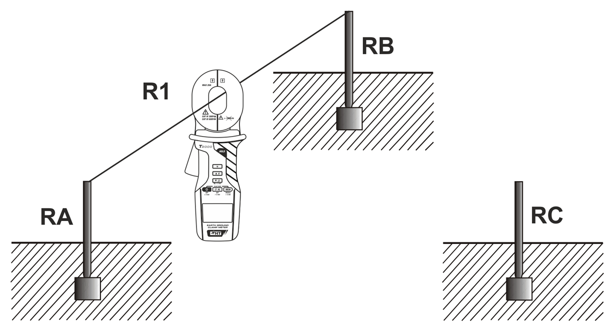 Jako pierwszy pomiar (patrz rysunek poniżej) połącz badany pręt RA z sondą RB i użyj przyrządu do pomiaru wartości rezystancji R1.