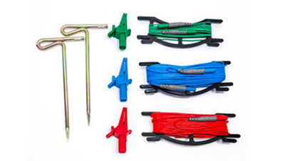 Zestaw w torbie zawierający 3 przewody zakończone obustronnie banankami (niebieski dł. 30m, czerwony dł. 15m, zielony dł. 3m), 3 krokodylki i 2 sondy dł. 25cm do pomiaru uziemień |