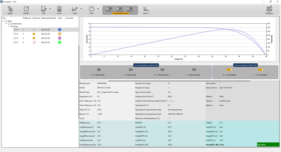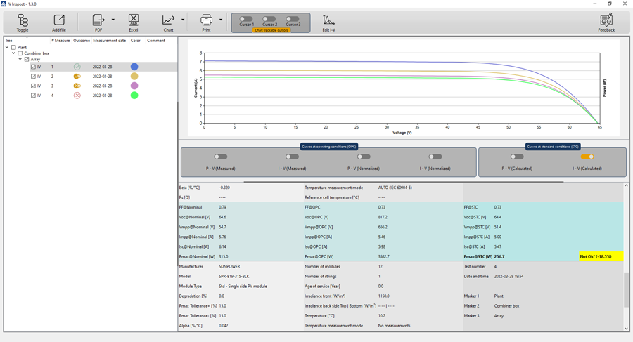 IV600 weryfikuje wydajność stringów fotowoltaicznych zgodnie z IEC/EN60891, wyznaczając charakterystykę I-V
