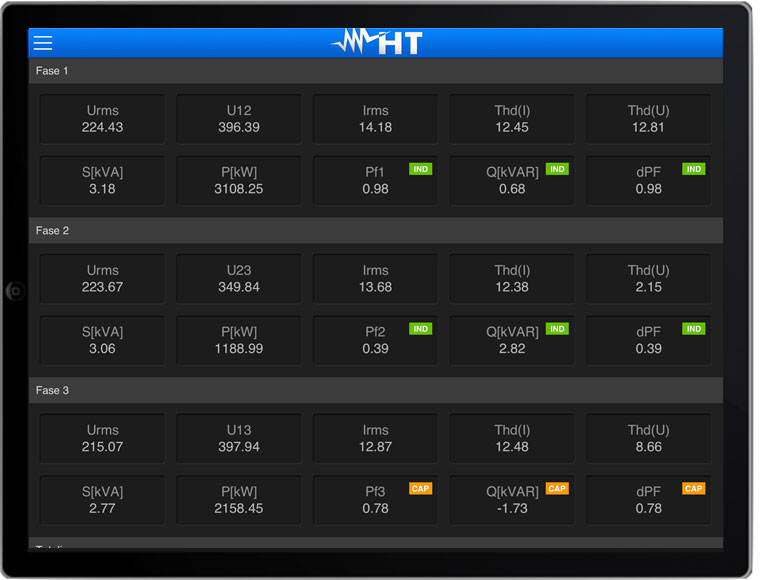Wszystkie elektryczne parametry mogą być wyświetlane w obu trybach cyfrowym i graficznym, w formie przebiegów, histogramów i wykresów wskazowych. Wykres wskazowy pokazuje kąt fazowy między dowolnym napięciem i odnośnym prądem, ujawniając charakter podłączonego obciążenia indukcyjny lub pojemnościowy.