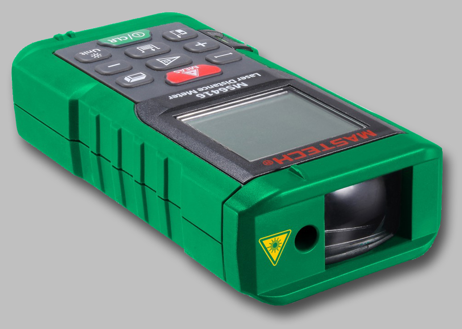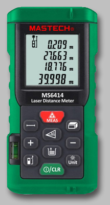 Laserowy miernik odległości do 40m, dokładność +/-1,5mm, sumowanie i odejmowanie pomiarów, obliczanie powierzchni i kubatury, użycie twierdzenia Pitagorasa, podświetlenie wyświetlacza, pamięć 99 wyników