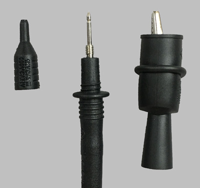 | Odkręcane osłony końcówek pomiarowych umożliwiają dokręcenie będących na wyposażeniu krokodylków |