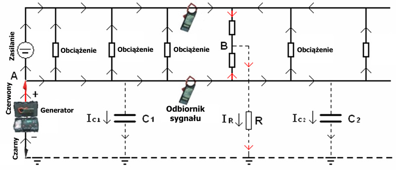 - Generator sygnału dołączany jest do badanego systemu DC dwoma przewodami pomiarowymi. Generator ten wymusza przepływ prądu, będący sygnałem o niskiej częstotliwości. Sygnał ten wpływa czerwonym przewodem pomiarowym do badanego systemu, natomiast wypływa z niego w punkcie zwarcia (lub osłabienia izolacji) do ziemi i ostatecznie powraca czarnym przewodem pomiarowym do generatora.