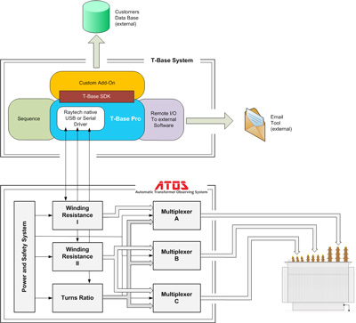 Przykład obok pokazuje rozbudowany system pomiarowy ze zdalnym sterowaniem, wymiana danych i analizą. Pokazany system Raytech-a nosi nazwę ATOS (Automatic Transformer Observing System), który jest w pełni sterowany z poziomu programu T-Base Pro. Rozszerzenie Add-Ons uzupełnia funkcjonalność dostosowując program do systemu komputerowego producenta transformatorów.