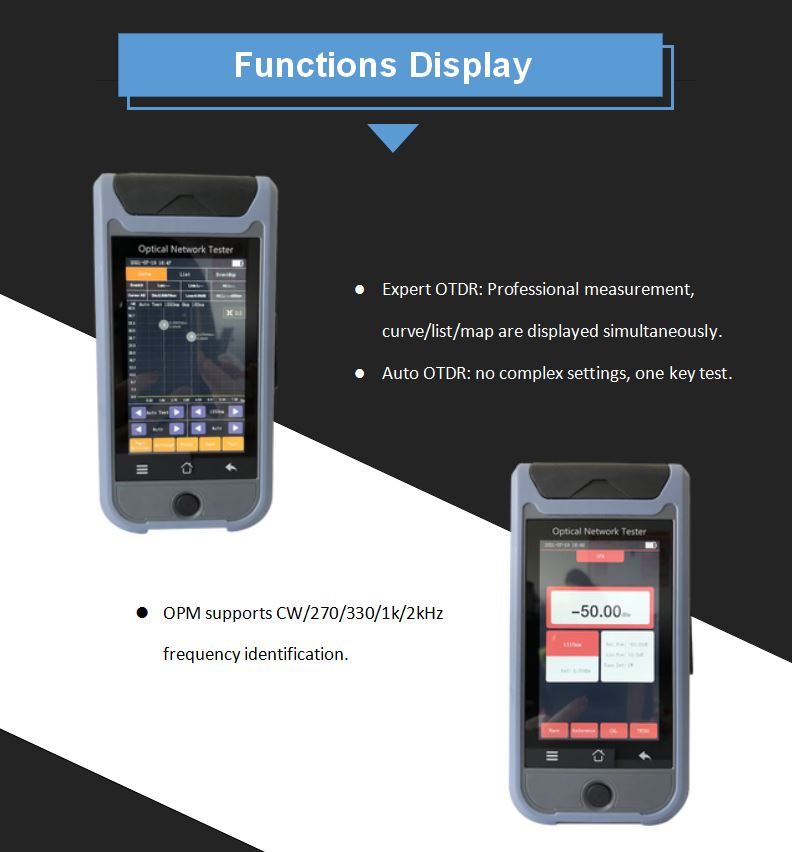 - Ekspert OTDR: profesjonalny pomiar, krzywe/lista/mapa są wyświetlane jednocześnie