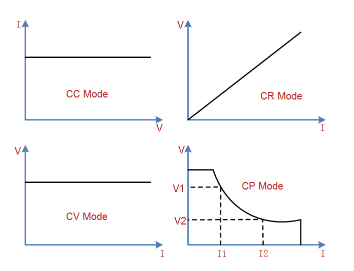 SDL1000X posiada cztery tryby pracy w celu zapewnienia elastycznych możliwości wykonywania badań. W trybie CC, obciążenie elektroniczne pobiera stały prąd niezależnie od napięcia na jego zaciskach. W trybie CV, obciążenie będzie utrzymywało stałe napięcia na swoich zaciskach. W trybie CR elektroniczne obciążenie będzie się zachowywało jak rezystor o stałej wartości. Jak pokazano na rysunku, elektroniczne obciążenie będzie liniowo zmieniało prąd zgodnie z napięciem na wejściu. W trybie CP, elektroniczne obciążenie będzie utrzymywało stałą moc pobieraną przez obciążenie.