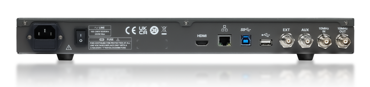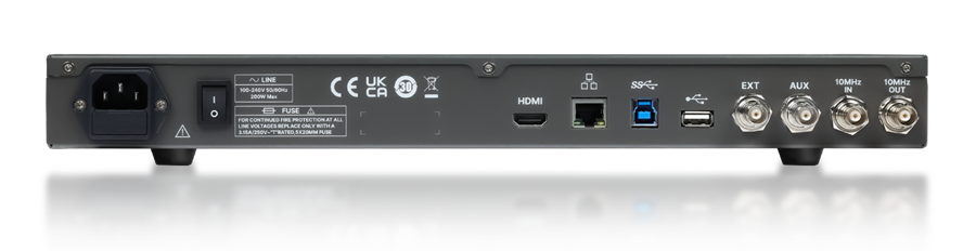 - Interfejsy obejmują: 1x USB Host 3.0, USB 2.0 Host, USB 3.0 Device (USBTMC), 1000M LAN, HDMI, External Triger In, Aux Out (Pass/Fail, Trigger Out), 10 MHz In, 10 MHz Out